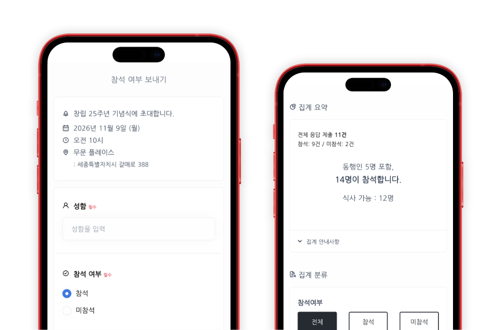 참석 여부 확인부터 정확한 인원 예측, 맞춤 요청 수렴, VIP 관리까지 하나의 시스템으로 빈틈없이 준비하세요.